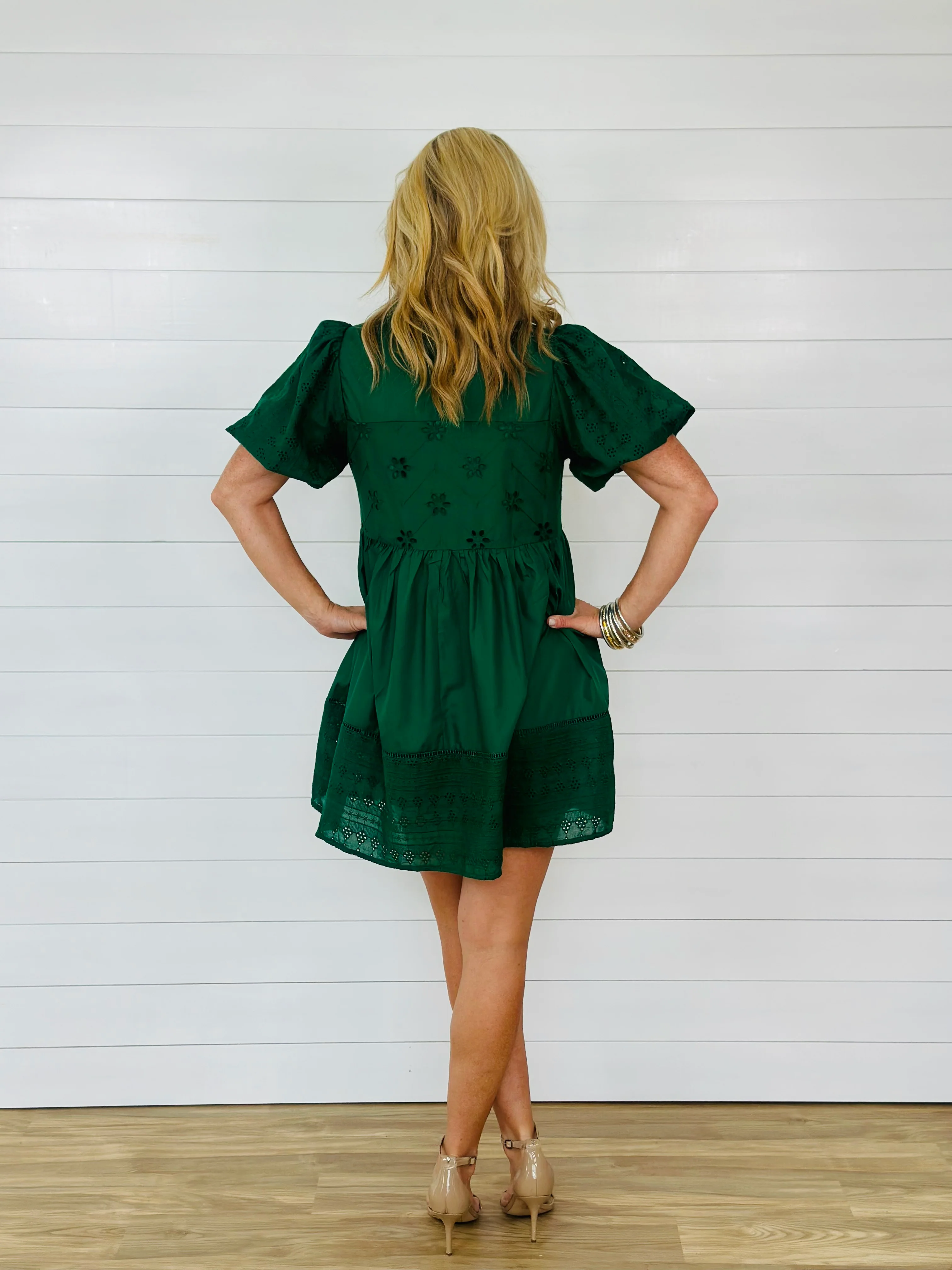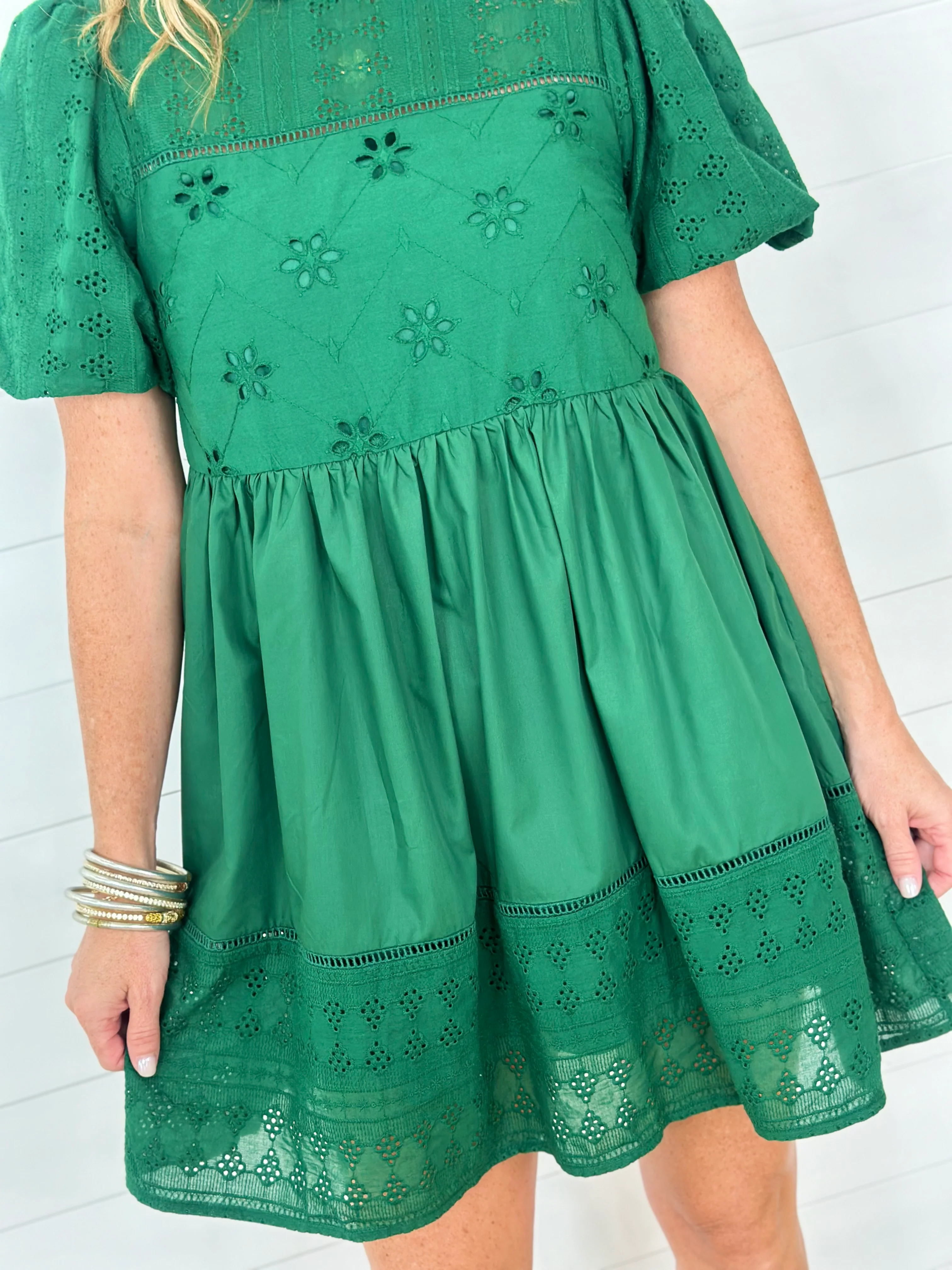ELISE EYELET DRESS-FOREST GREEN