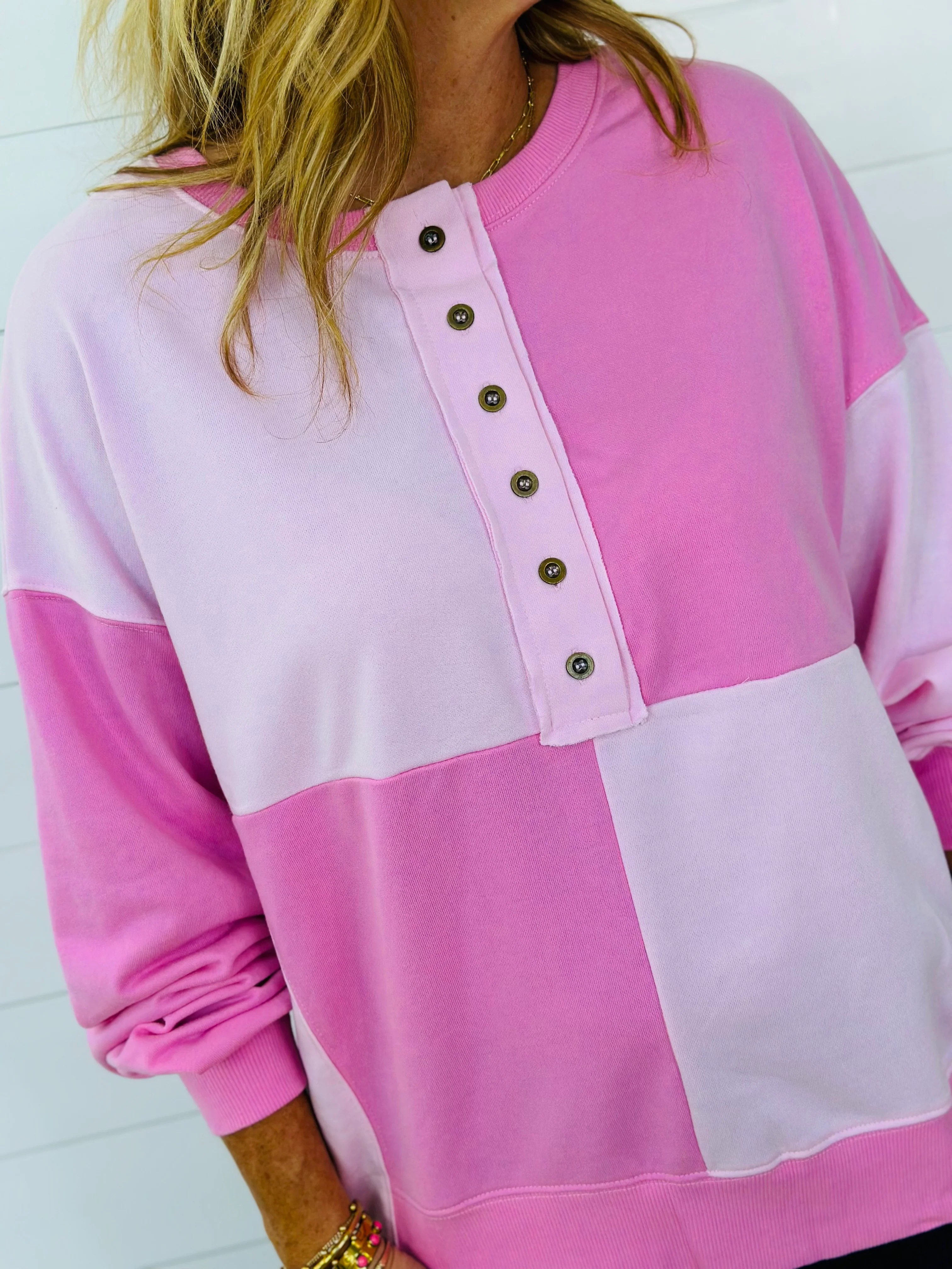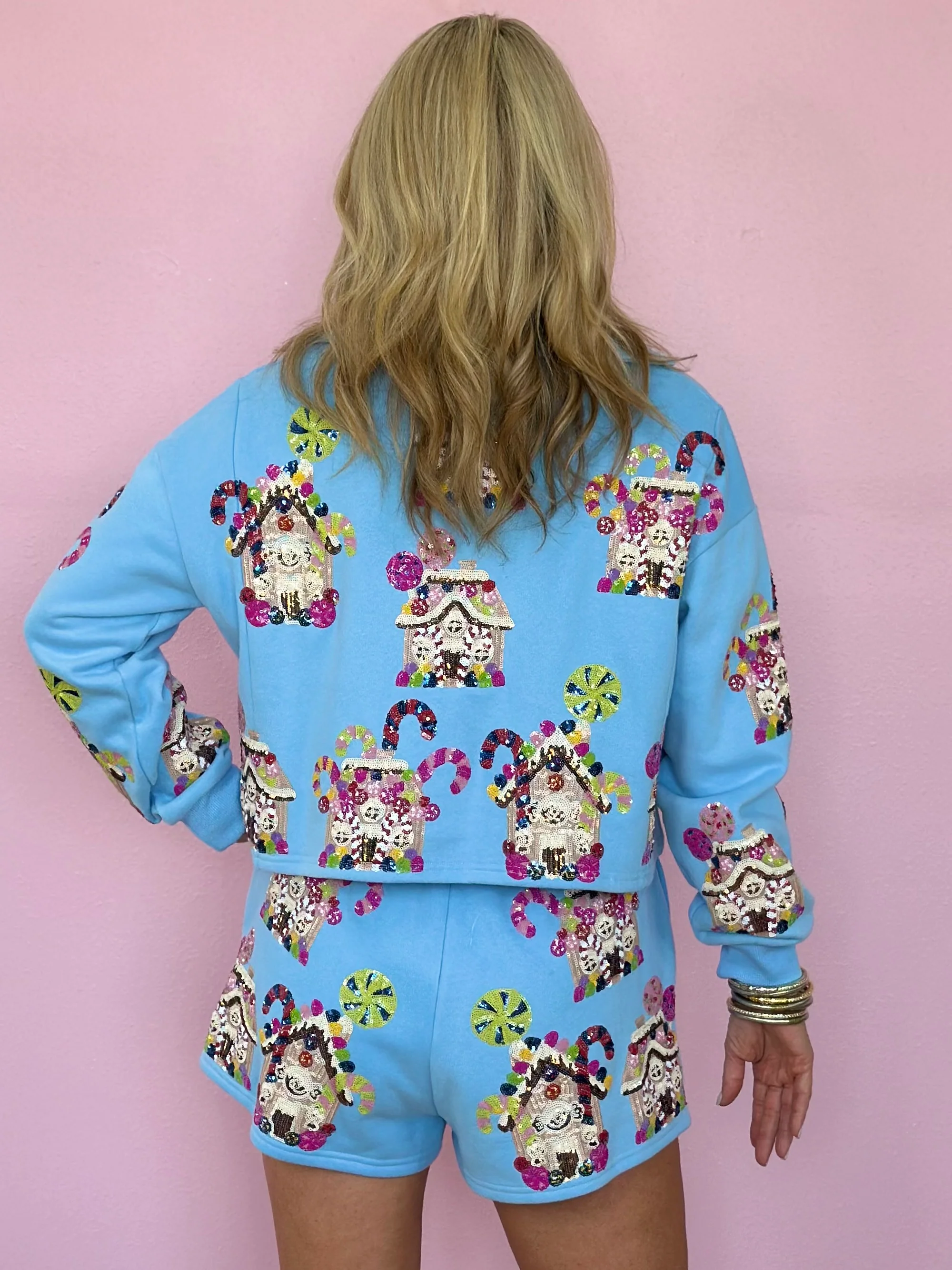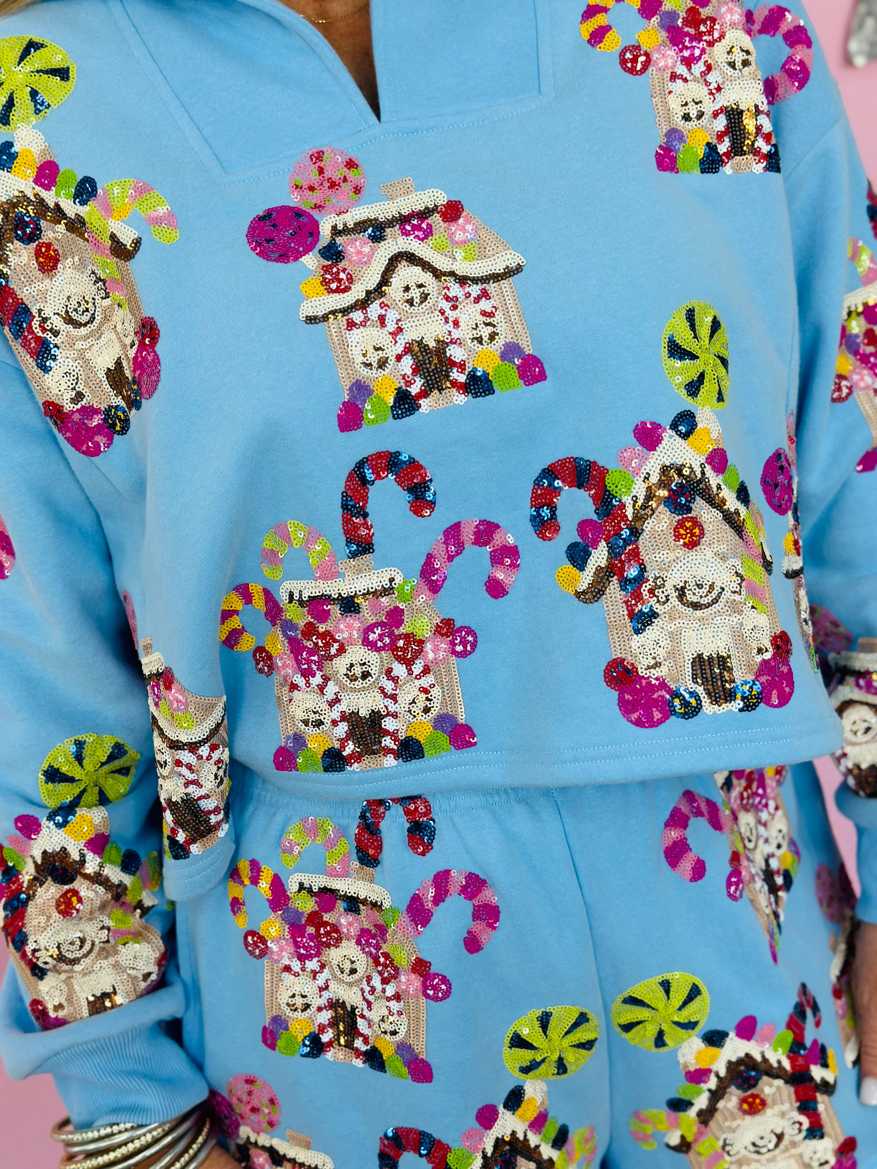 LT BLUE GINGERBREAD HOUSES COLLAR SWEATSHIRT