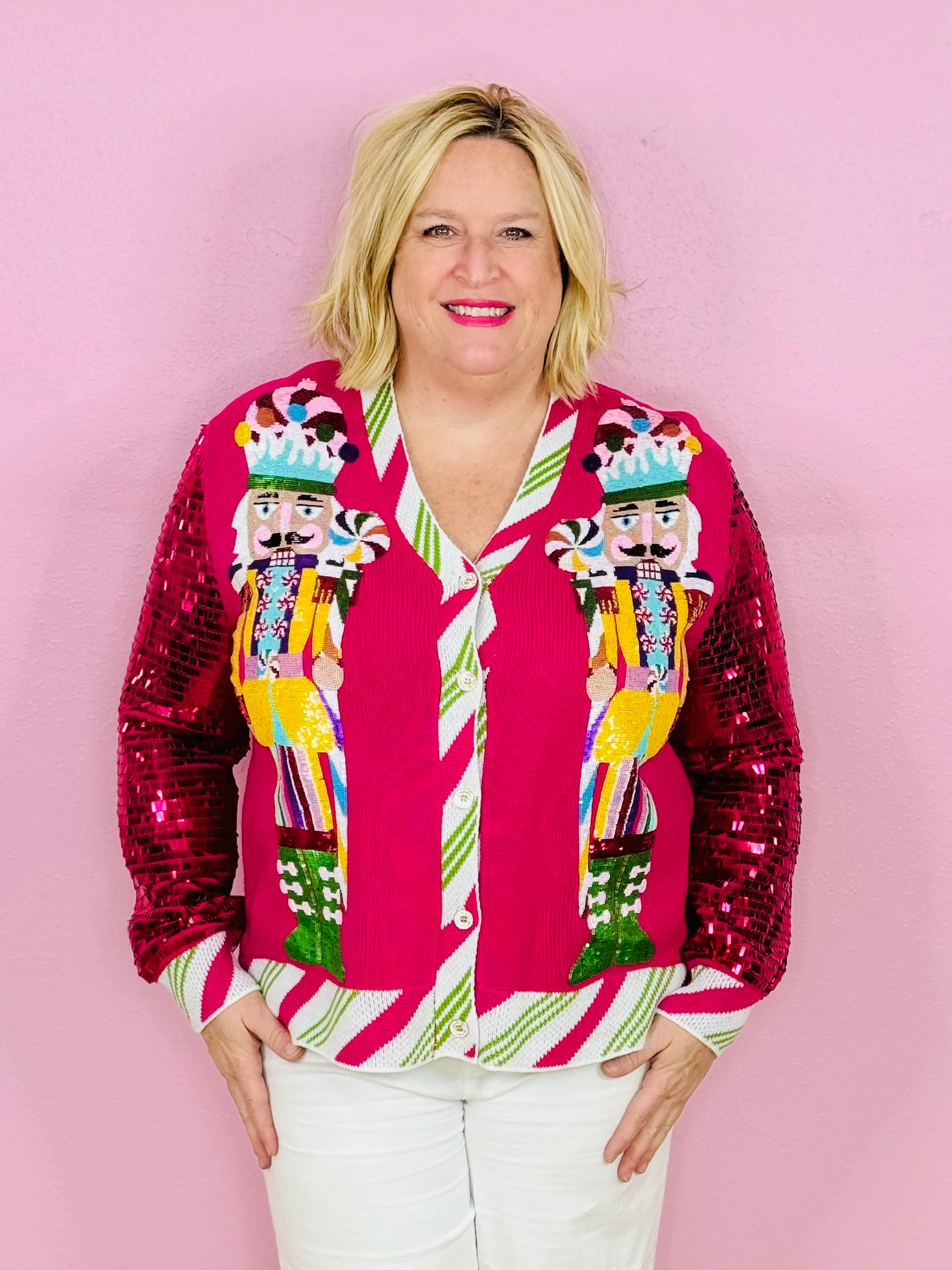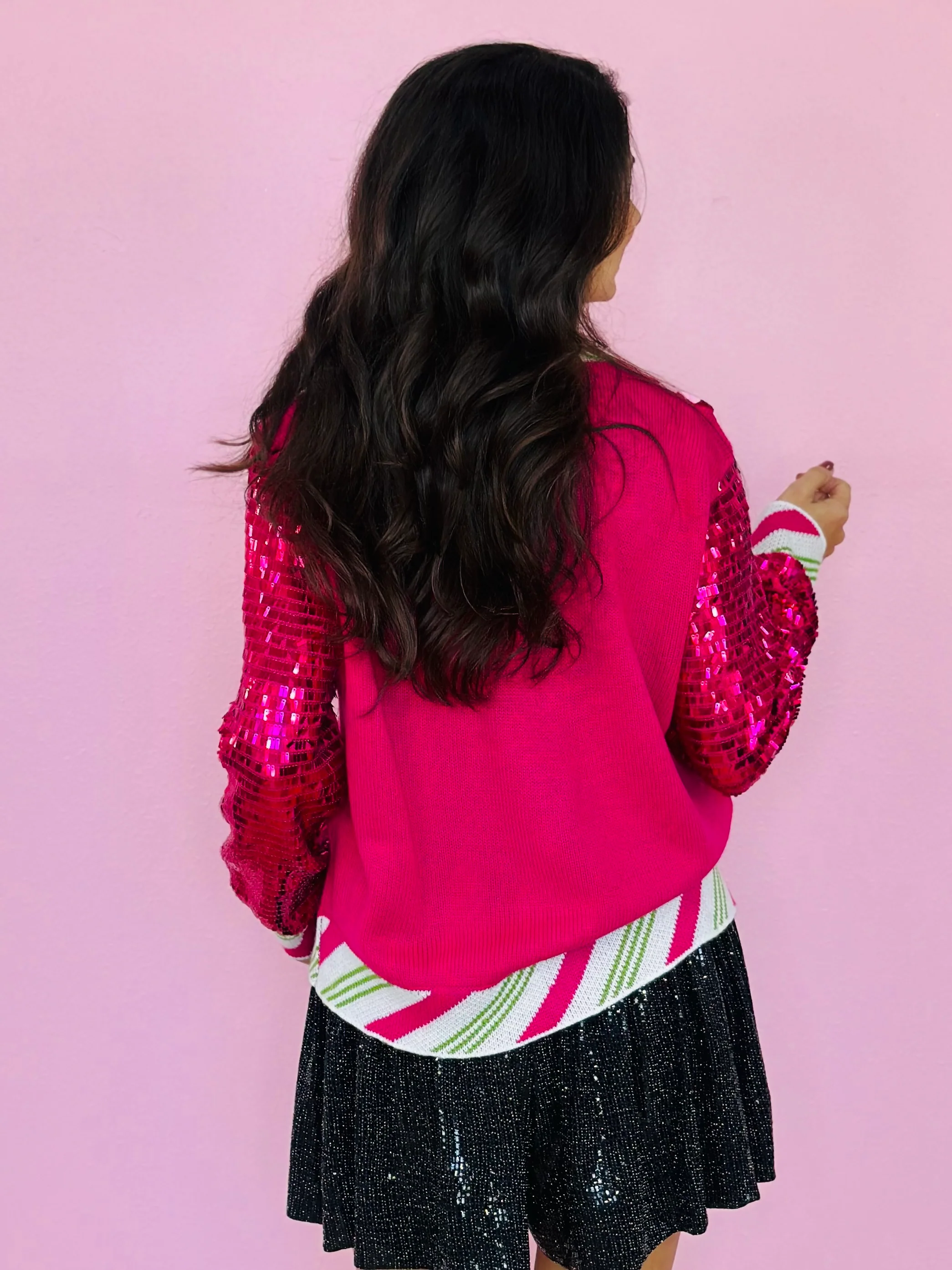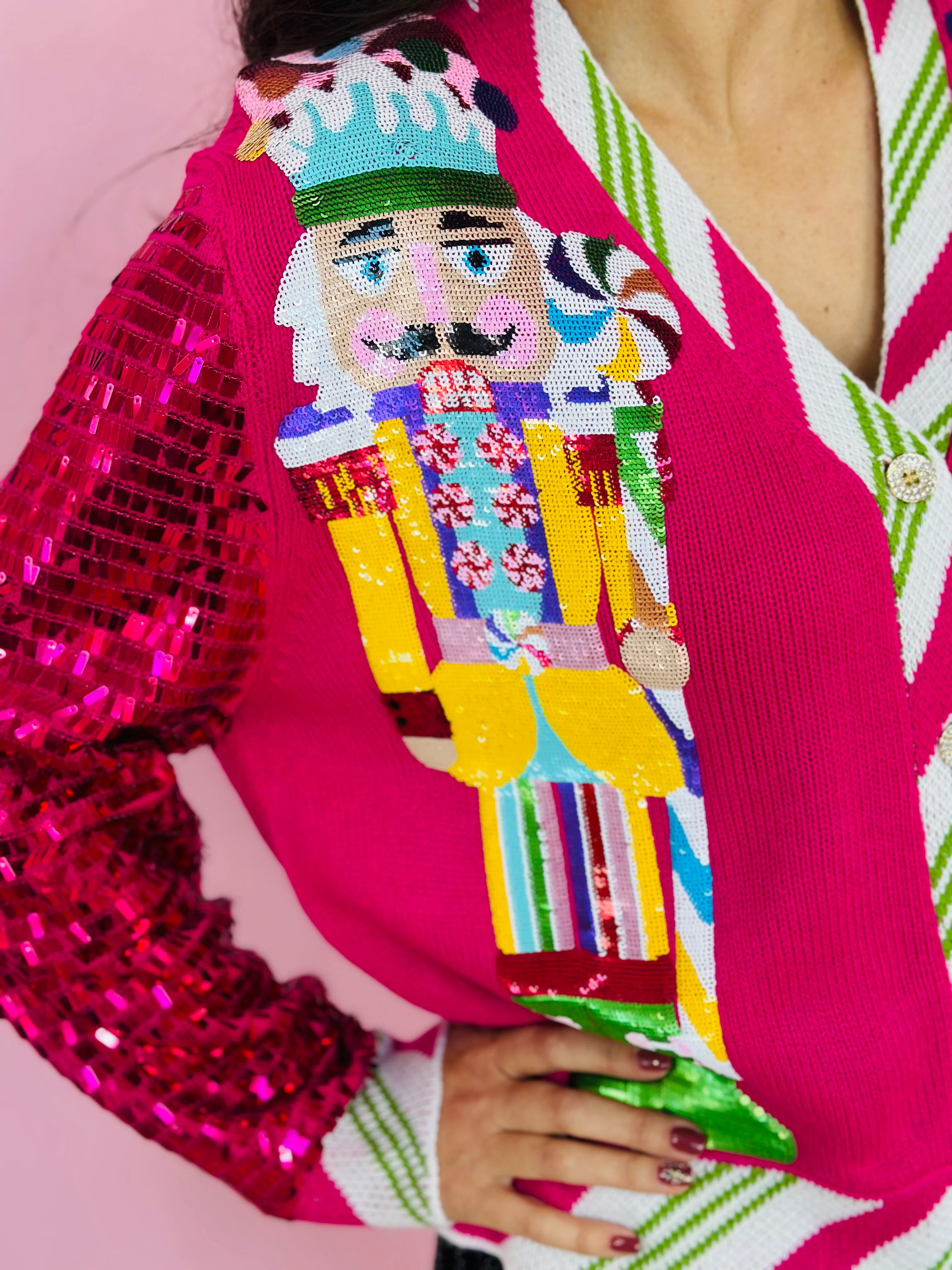 HOT PINK PEPPERMINT NUTCRACKER SEQUIN SLEEVE CARDIGAN